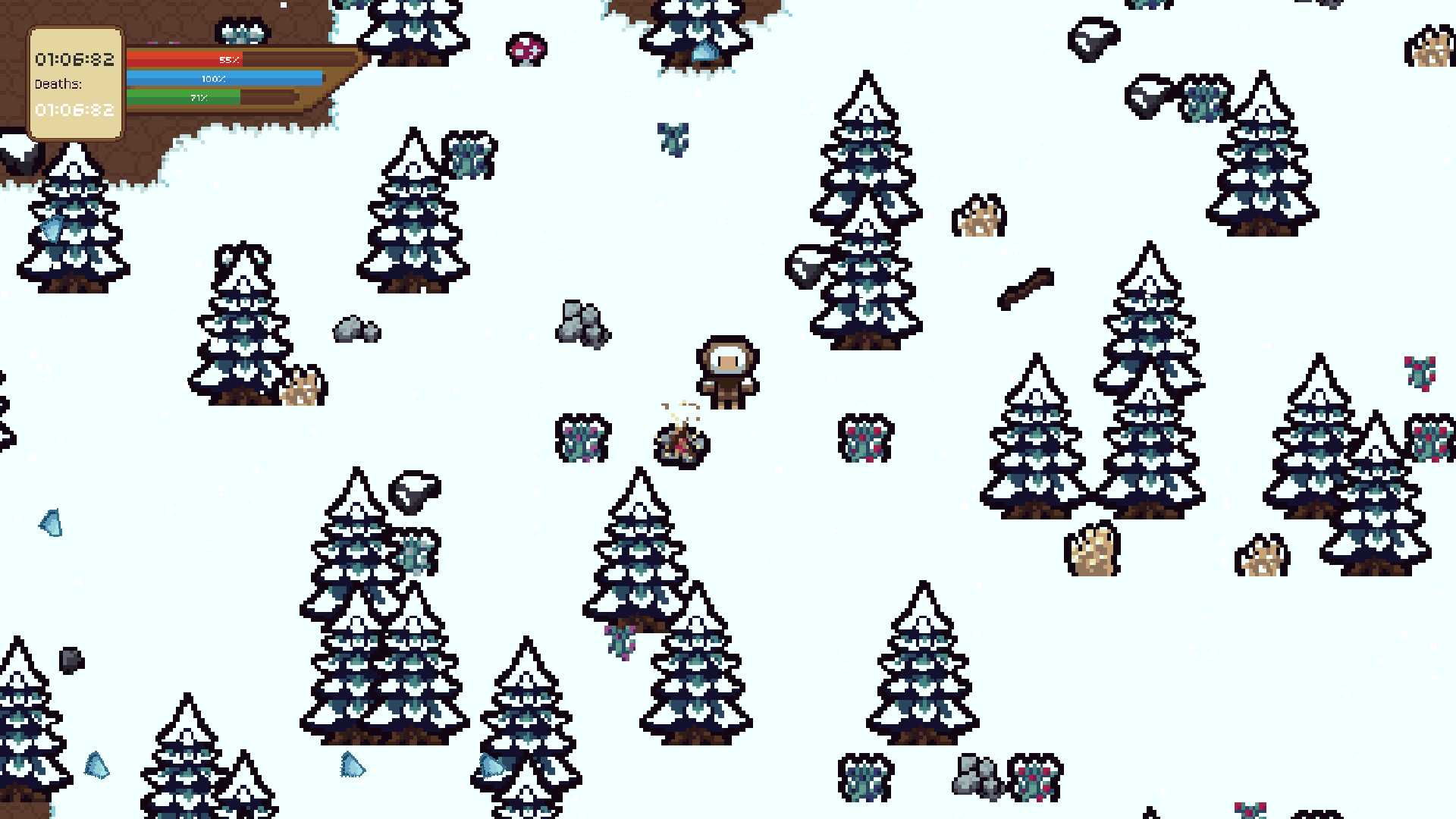 Go through the forest and collect berries, sticks, coal to fulfil your quest.